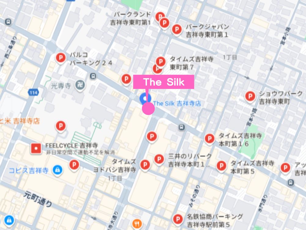 ※the SILK 吉祥寺店には専用駐車場がないため、お車でお越しの際は近隣のコインパーキングをご利用ください。吉祥寺駅周辺には複数のコインパーキングがあります。