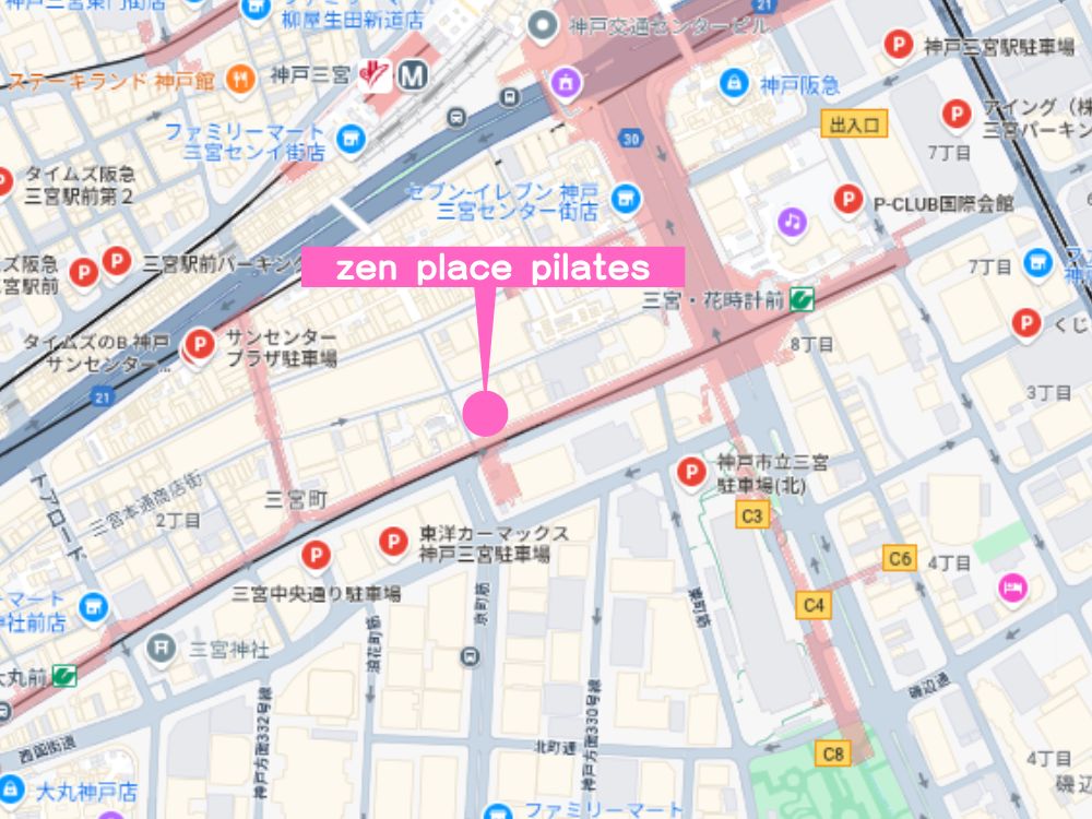 レッスン開始の30分前までにスタジオに到着しましょう。zen place pilates(ゼンプレイスピラティス) 三宮店は、JR三ノ宮駅の中央改札口を出て8分、地下鉄新神戸「三宮・花時計前」南改札口を出て1分の場所にあります。